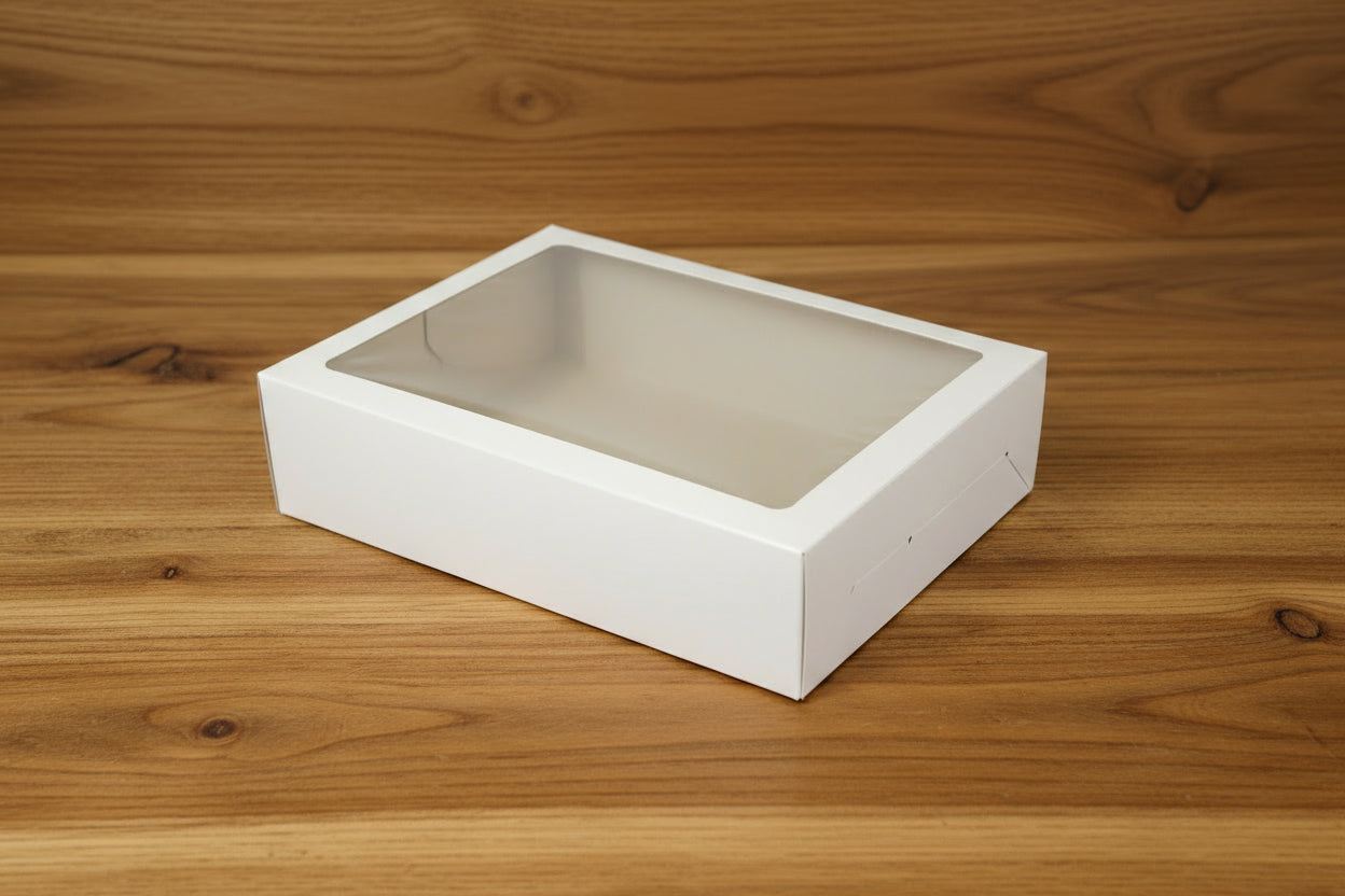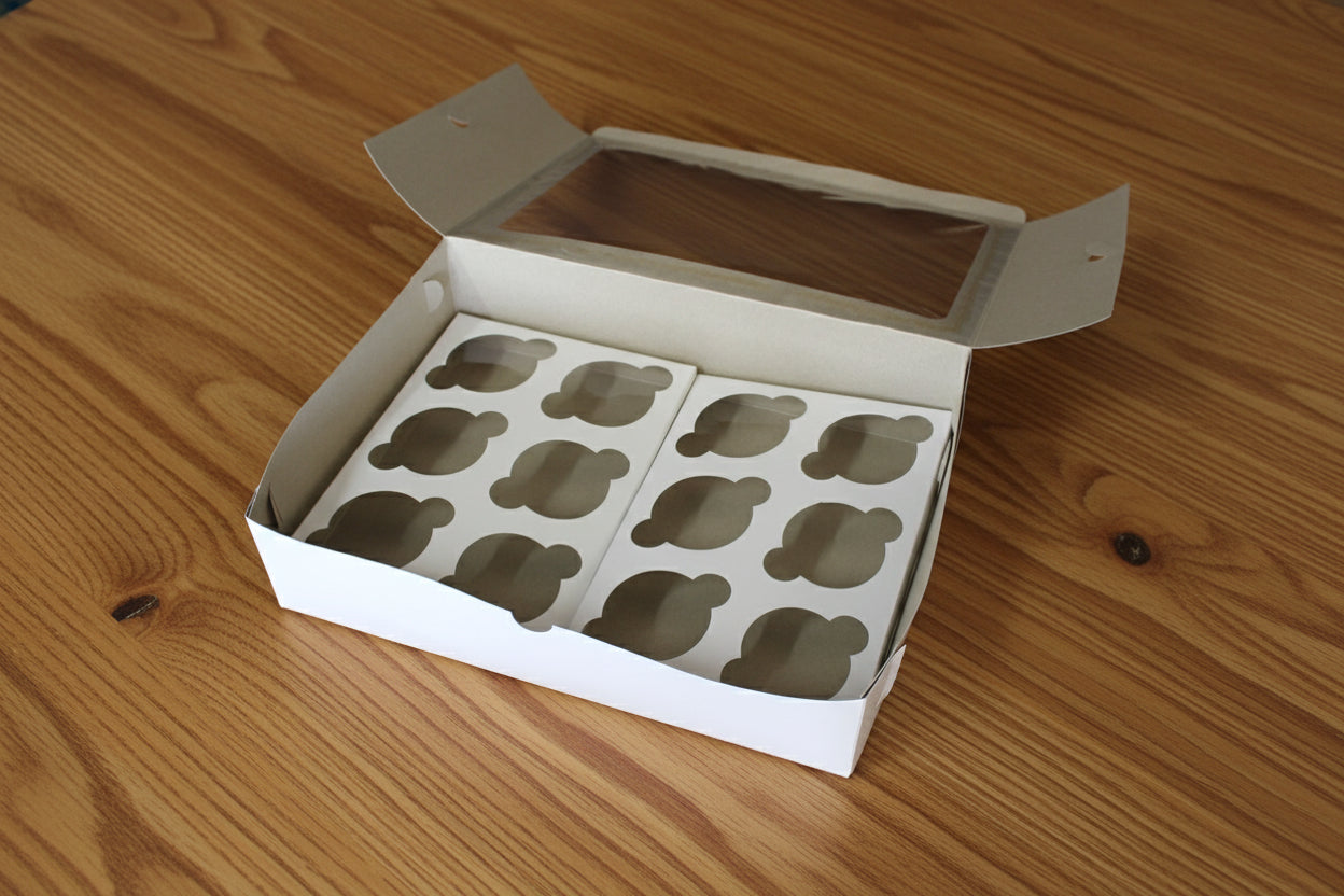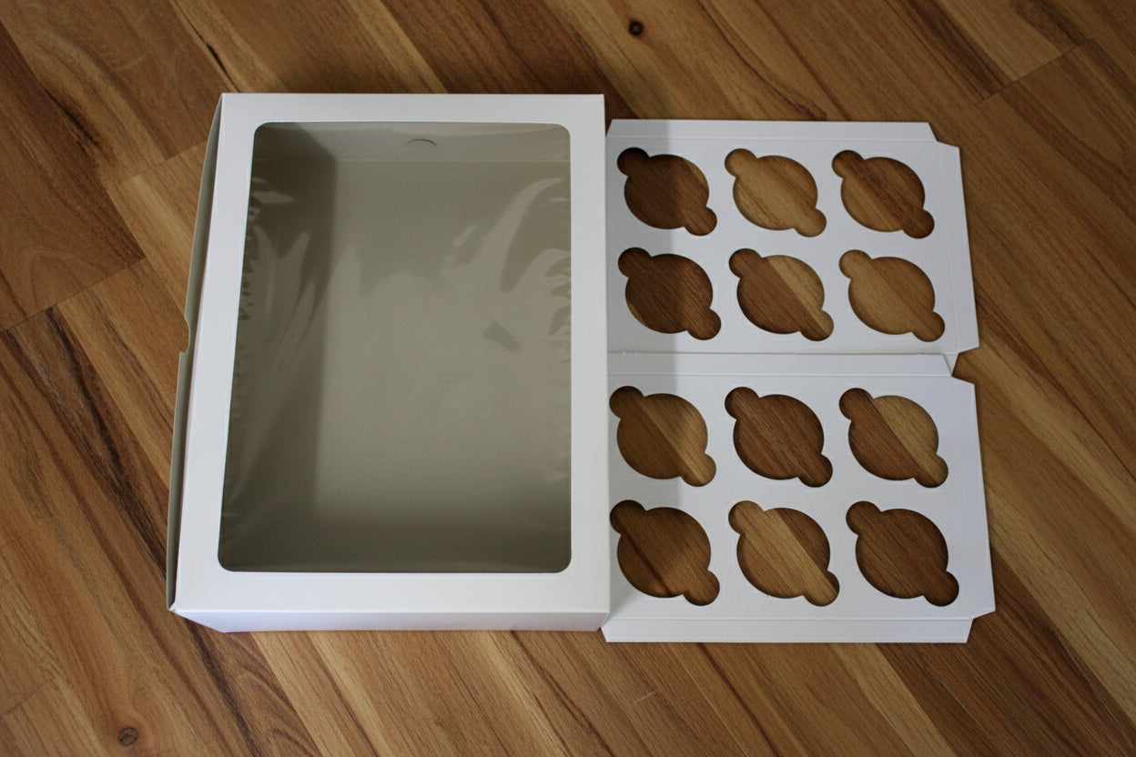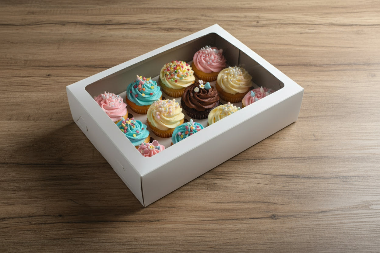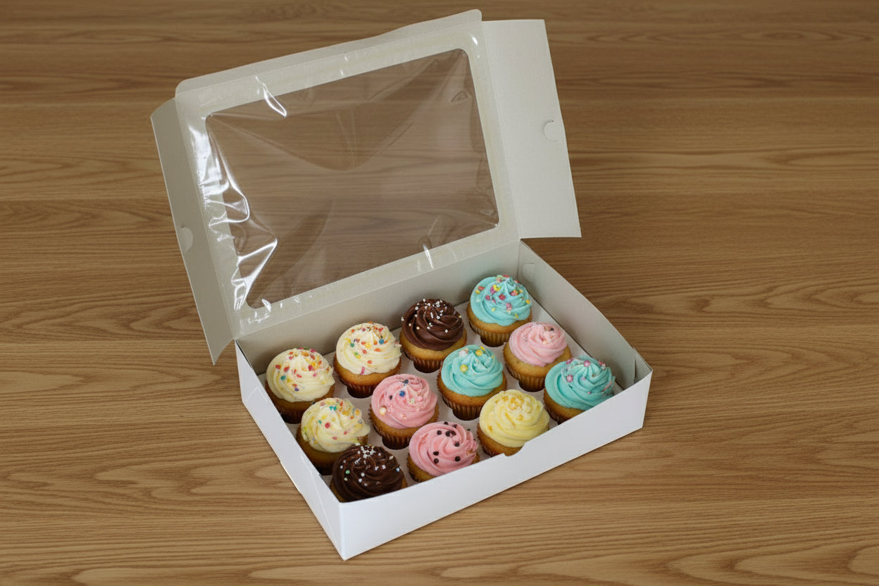 Showcase a dozen cupcakes in style. Designed for bakers and gifters, this professional white box securely holds 12 standard cupcakes. The sturdy construction, secure-fit insert, and large display window ensure your creations are protected and beautifully presented for any occasion.