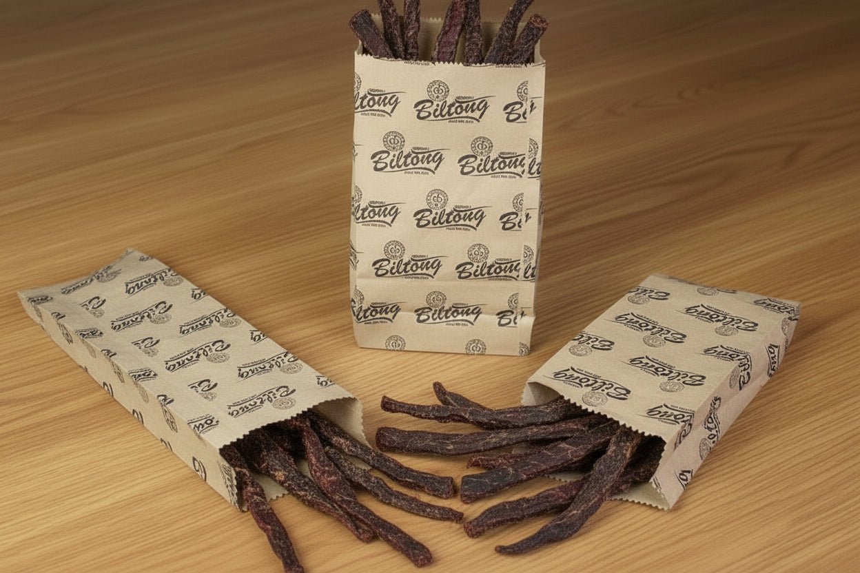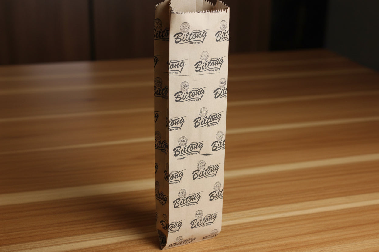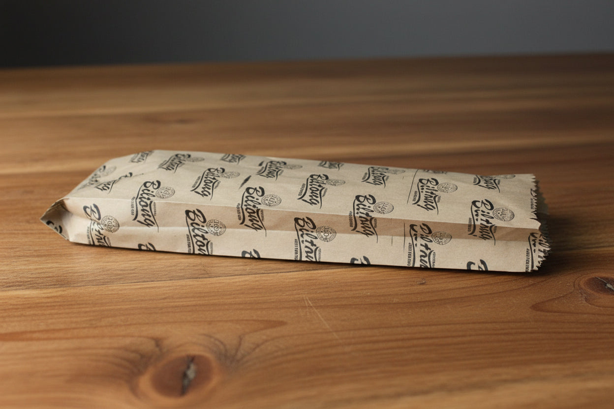 Multi-purpose FLAT BILTONG brown paper bags. Natural, durable, and eco-friendly for all your packaging needs. These multi-use bags offer an environmentally conscious packaging solution for retail, take-out, or homemade treats. Easily recyclable and biodegradable.