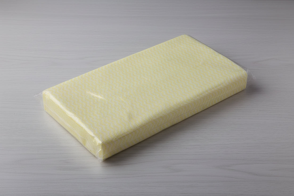 Introducing our WIPES-YELLOW/WHITE SPUN LACE(50) for effective cleaning and hygienic practices. These wipes are made from high-quality spun lace material, ensuring durability and absorbency with every use.